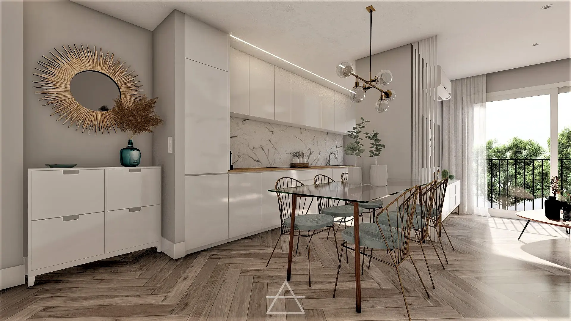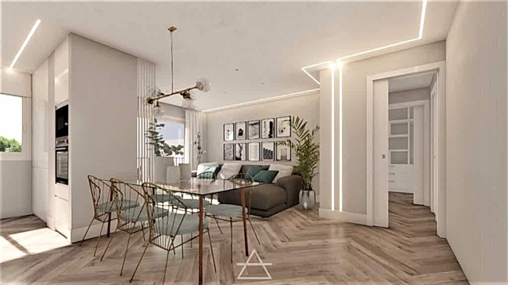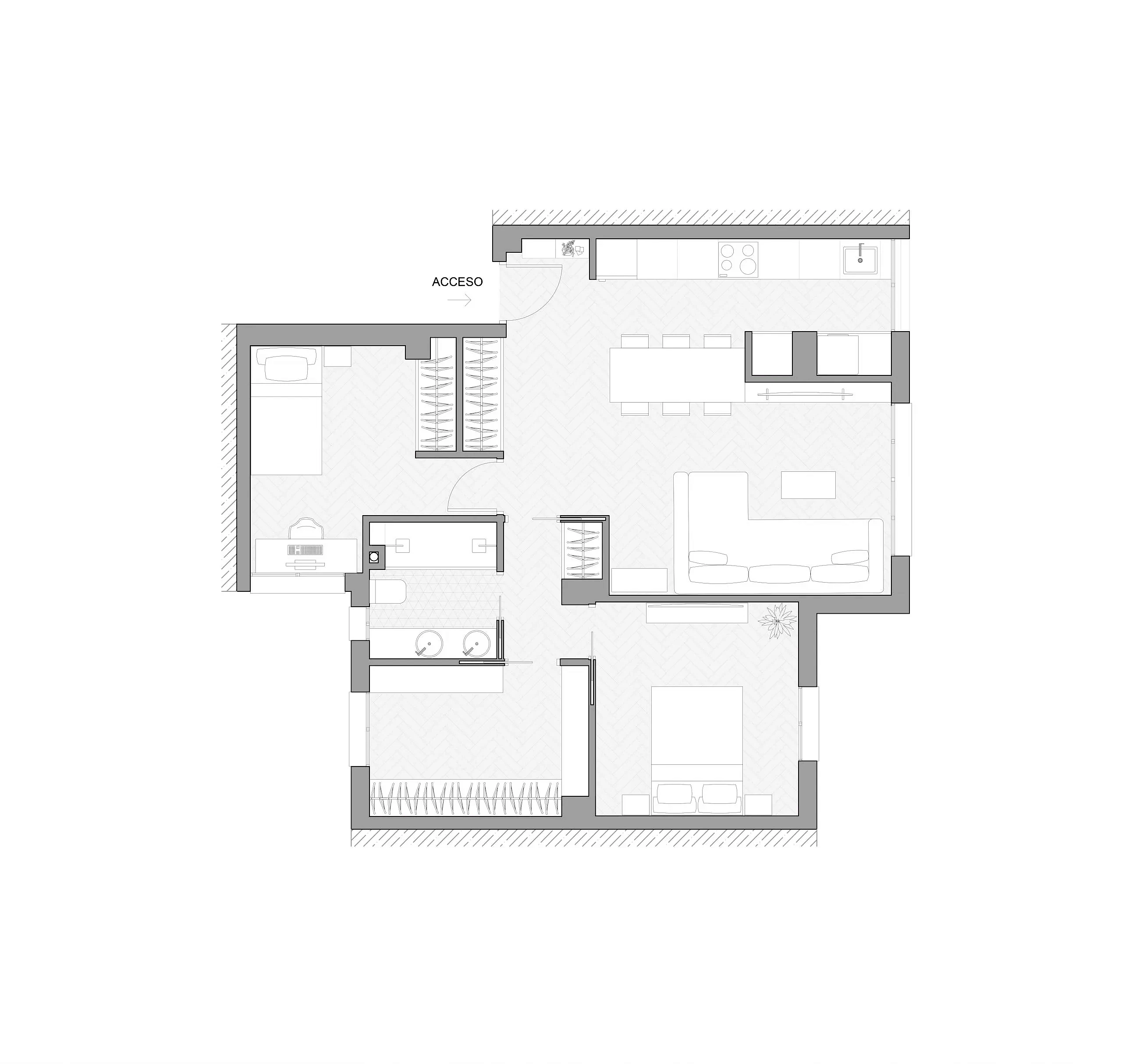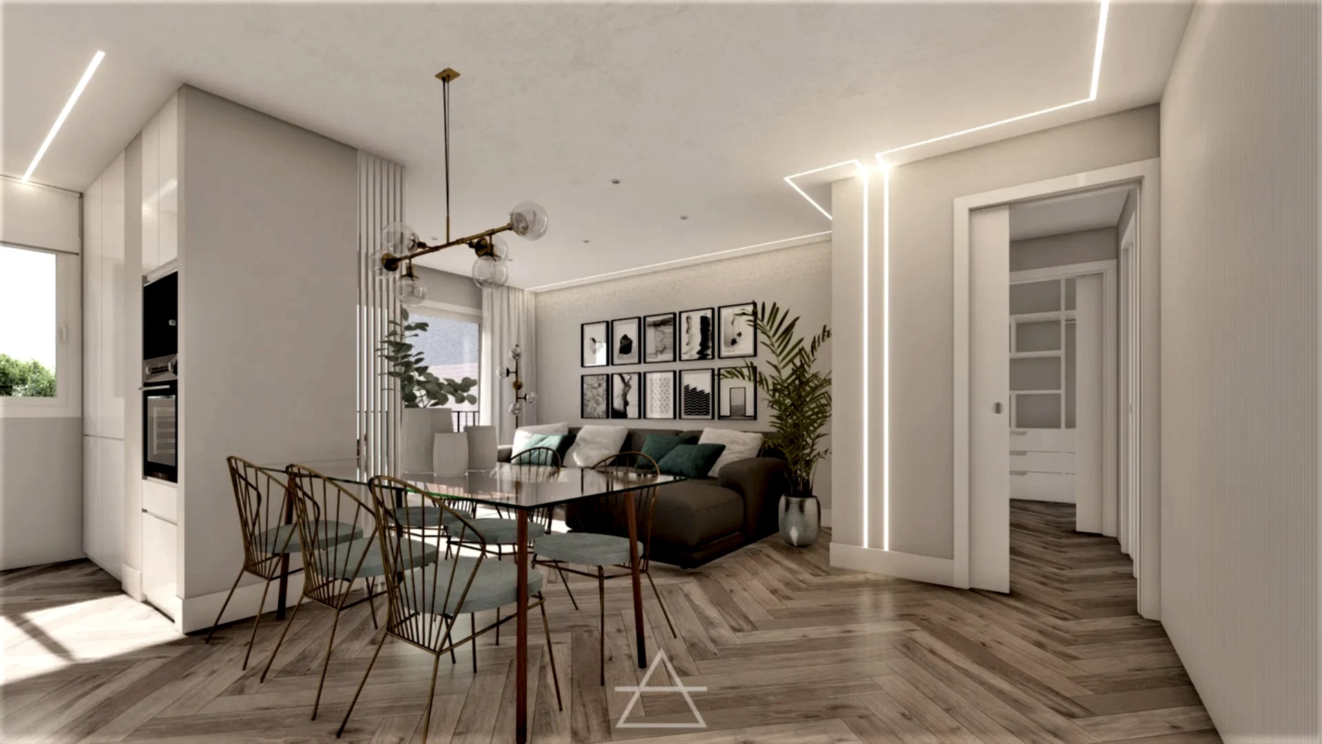 Para ello se propone un concepto de espacio abierto en la zona de día, donde unificamos el vestíbulo, la cocina, el salón y el comedor, consiguiendo un espacio mucho más amplio y funcional. A su vez, para conseguir más luz natural y ventilación cruzada se han modificado las ventanas del espacio, convirtiendo una de ellas en un gran ventanal. Las zonas de noche quedan relegadas a un segundo plano. El espacio principal se separada por un pequeño vestíbulo con puerta corredera, mientras que para el acceso al segundo dormitorio se ha realizado un diseño de carpintería oculta que aúna el acceso al dormitorio y un gran armario que da servicio al vestíbulo de entrada.