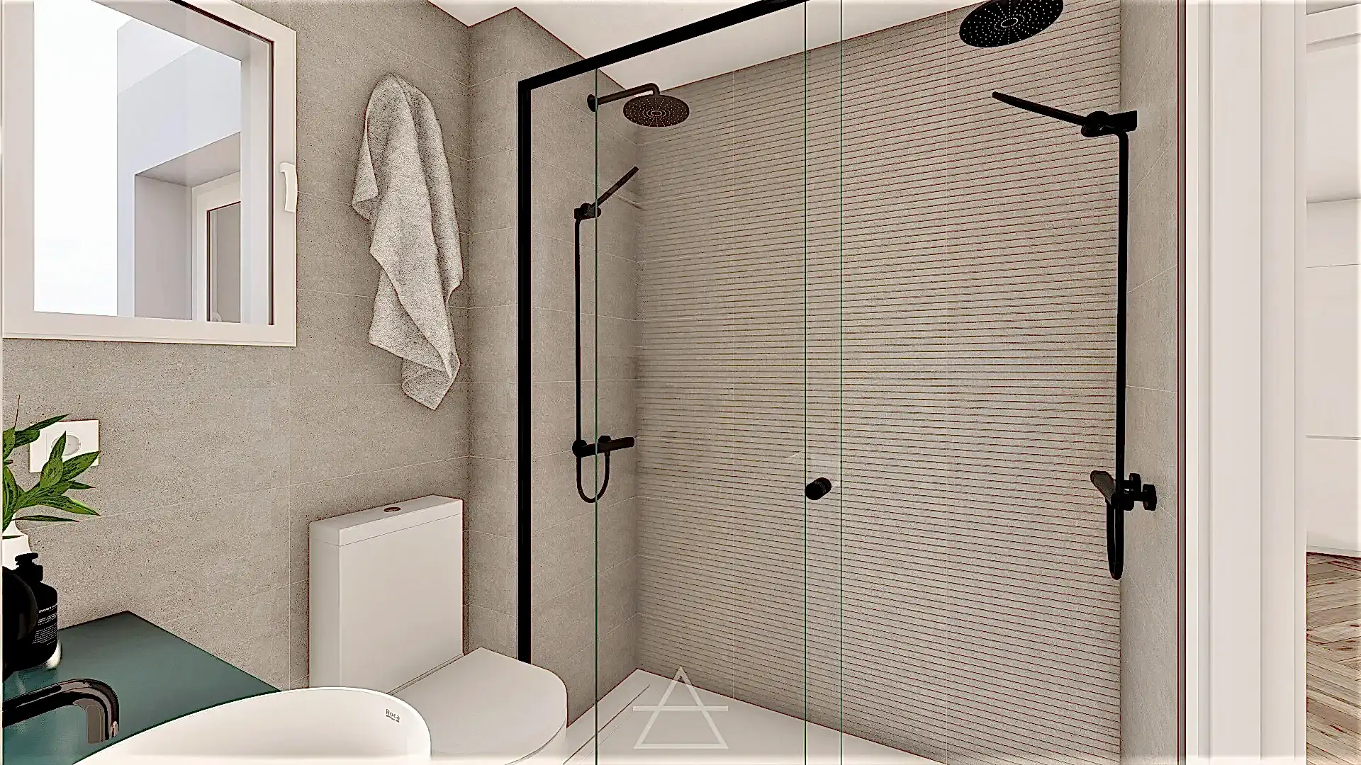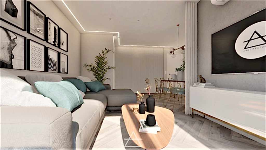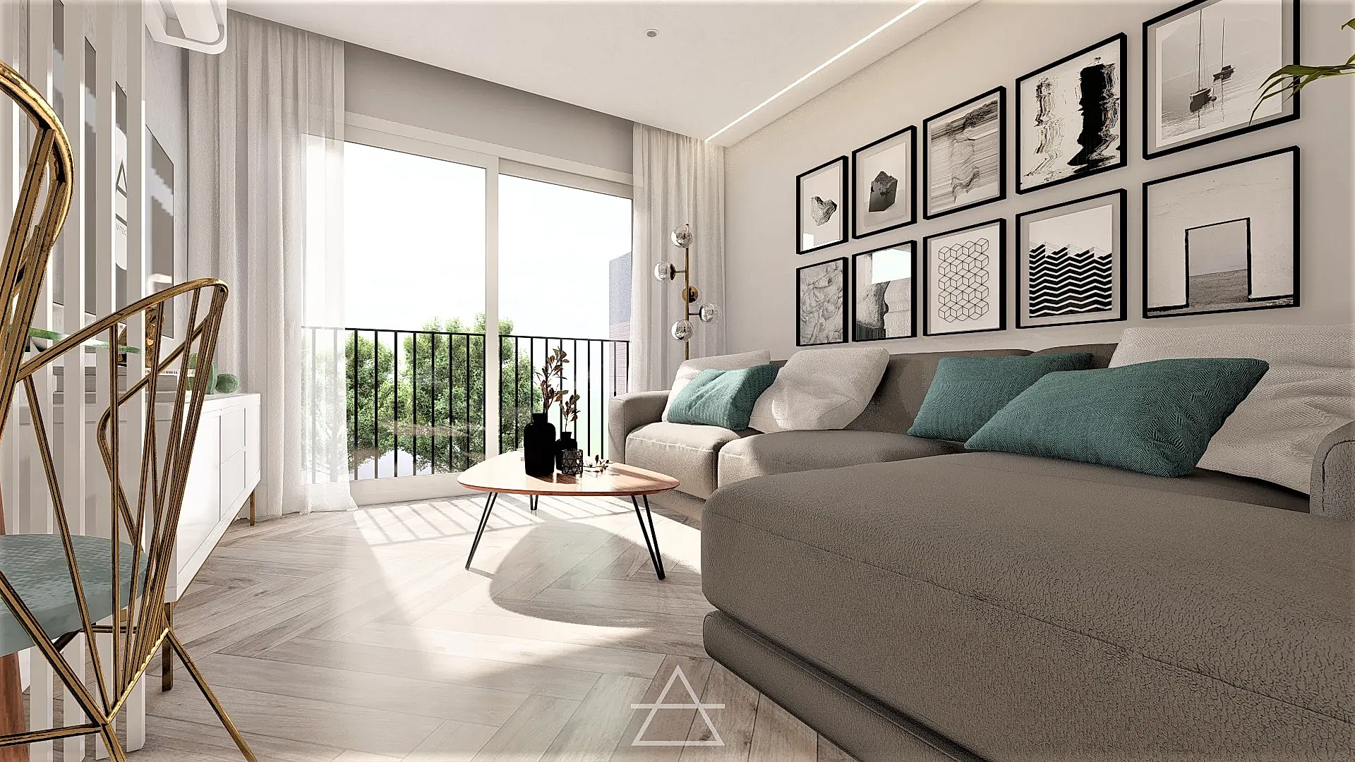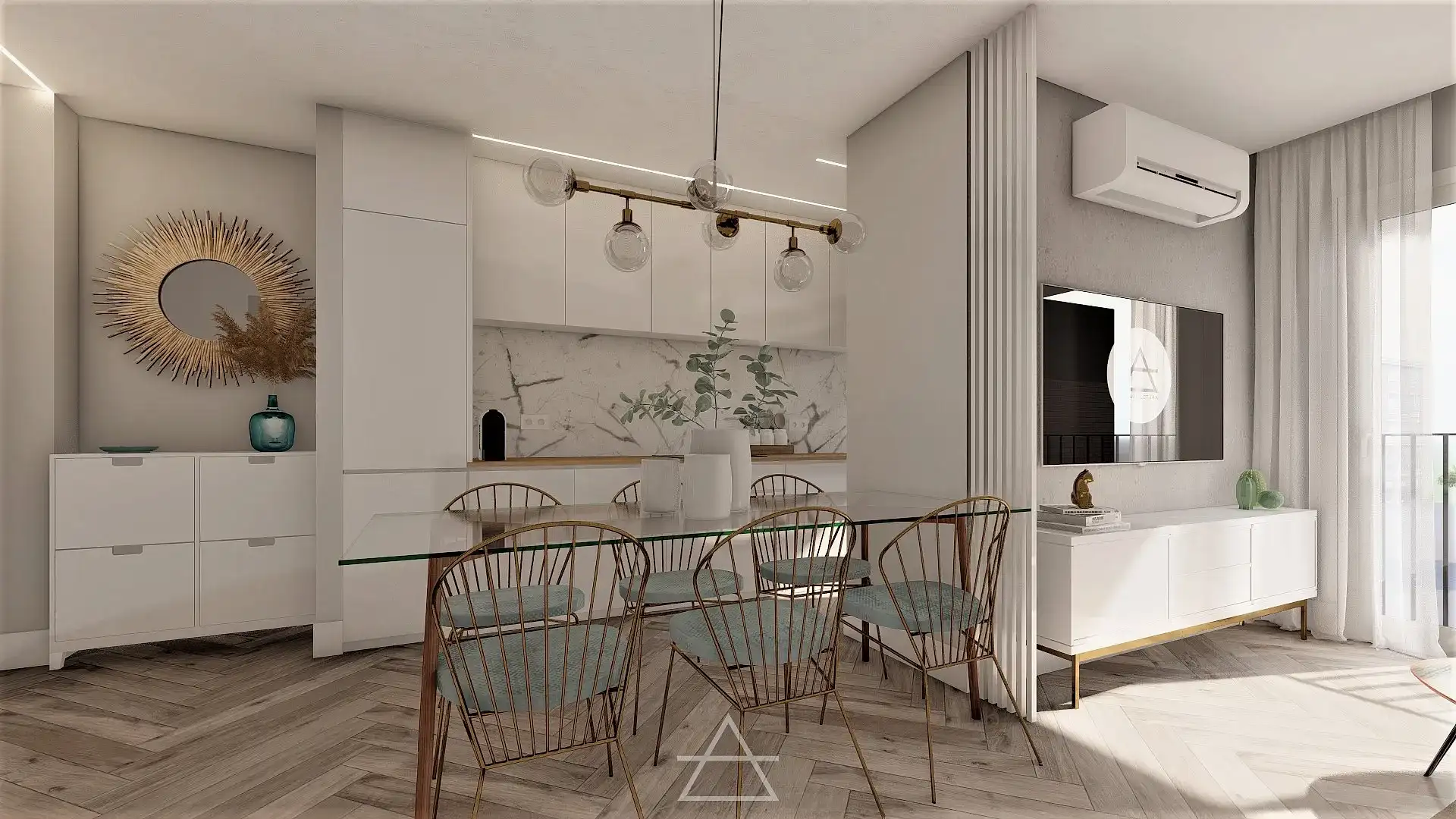 Para ello se propone un concepto de espacio abierto en la zona de día, donde unificamos el vestíbulo, la cocina, el salón y el comedor, consiguiendo un espacio mucho más amplio y funcional. A su vez, para conseguir más luz natural y ventilación cruzada se han modificado las ventanas del espacio, convirtiendo una de ellas en un gran ventanal. Las zonas de noche quedan relegadas a un segundo plano. El espacio principal se separada por un pequeño vestíbulo con puerta corredera, mientras que para el acceso al segundo dormitorio se ha realizado un diseño de carpintería oculta que aúna el acceso al dormitorio y un gran armario que da servicio al vestíbulo de entrada.