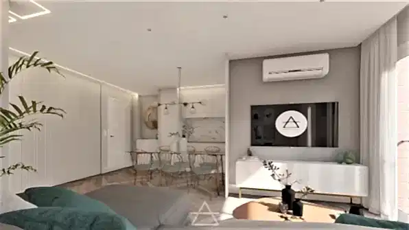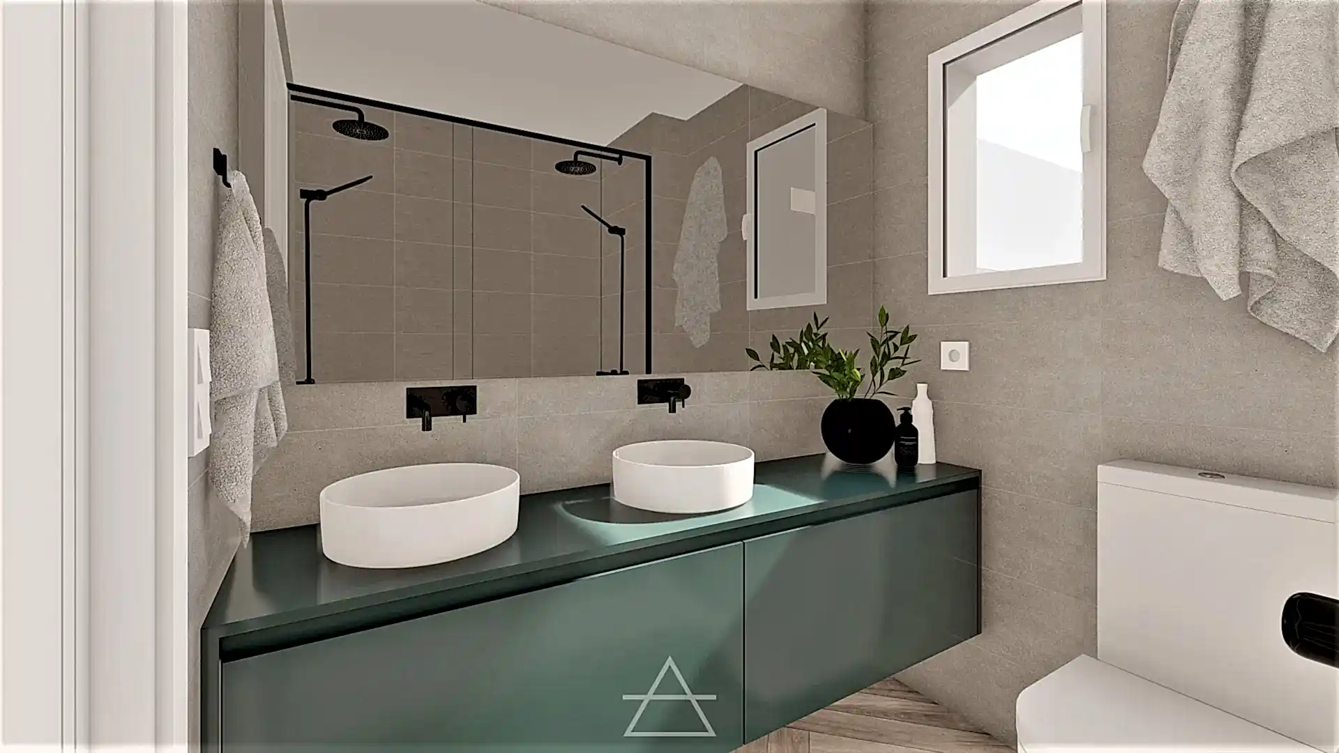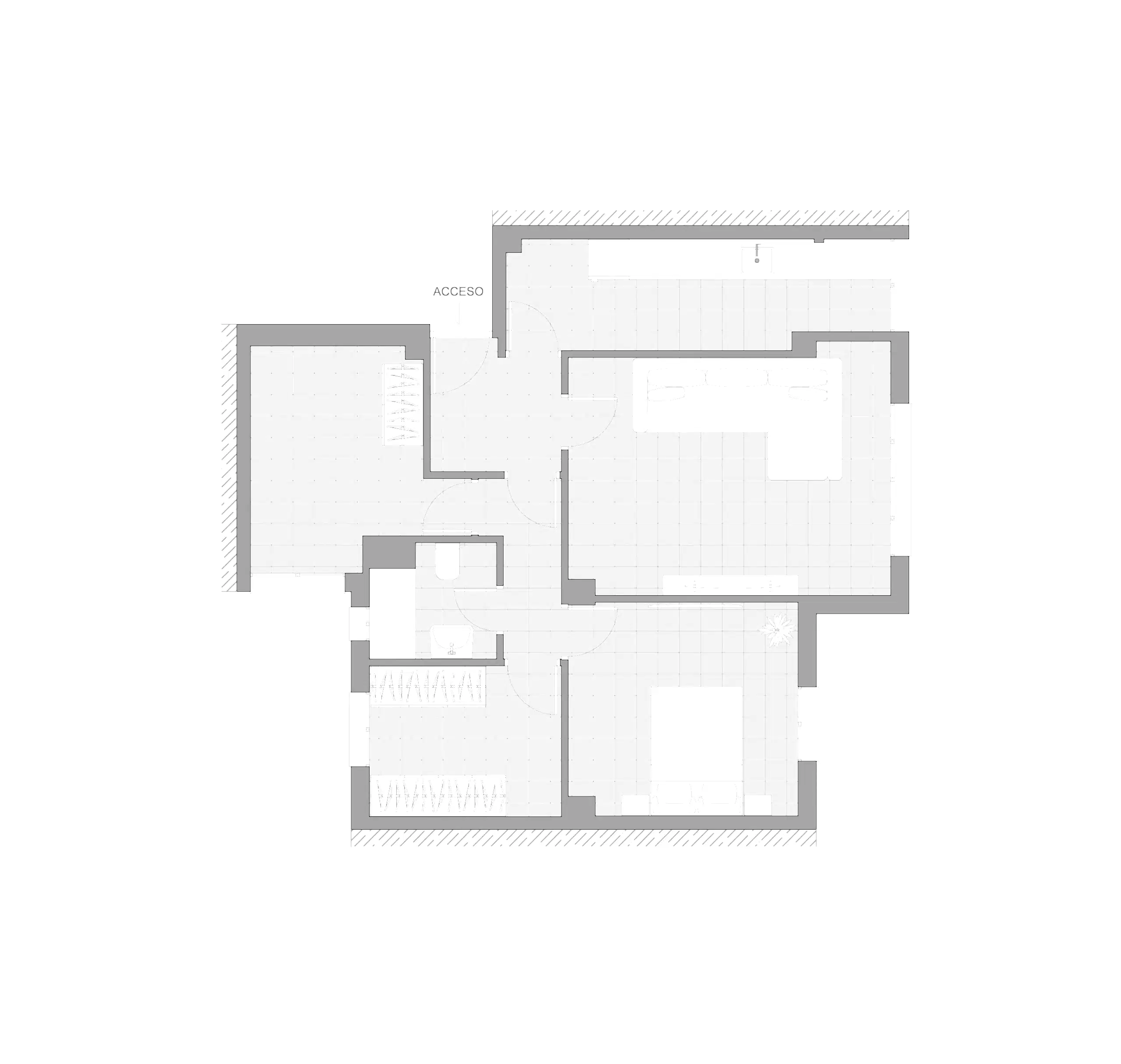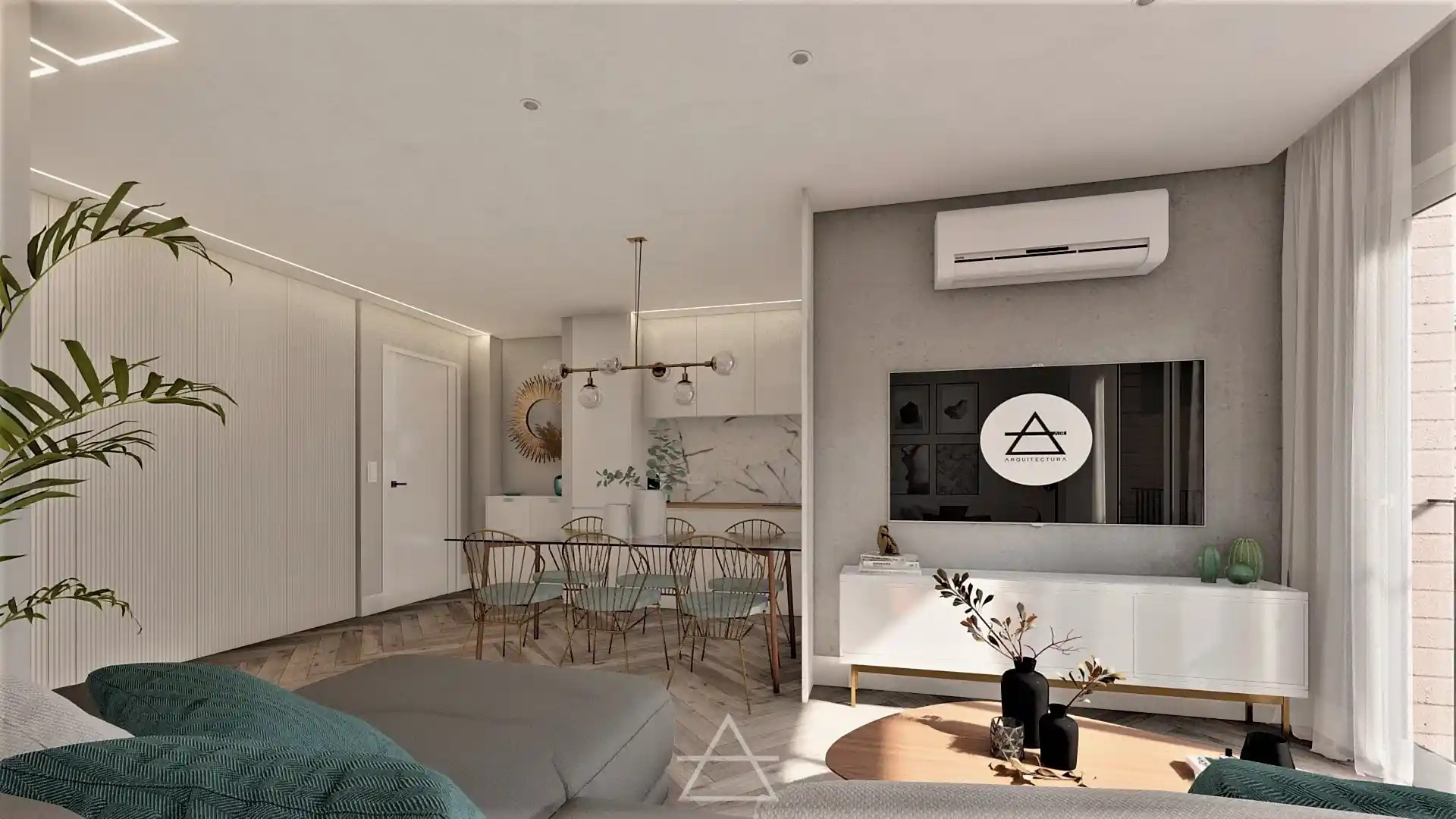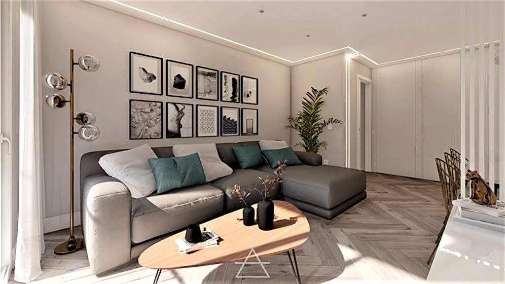 Para ello se propone un concepto de espacio abierto en la zona de día, donde unificamos el vestíbulo, la cocina, el salón y el comedor, consiguiendo un espacio mucho más amplio y funcional. A su vez, para conseguir más luz natural y ventilación cruzada se han modificado las ventanas del espacio, convirtiendo una de ellas en un gran ventanal. Las zonas de noche quedan relegadas a un segundo plano. El espacio principal se separada por un pequeño vestíbulo con puerta corredera, mientras que para el acceso al segundo dormitorio se ha realizado un diseño de carpintería oculta que aúna el acceso al dormitorio y un gran armario que da servicio al vestíbulo de entrada.