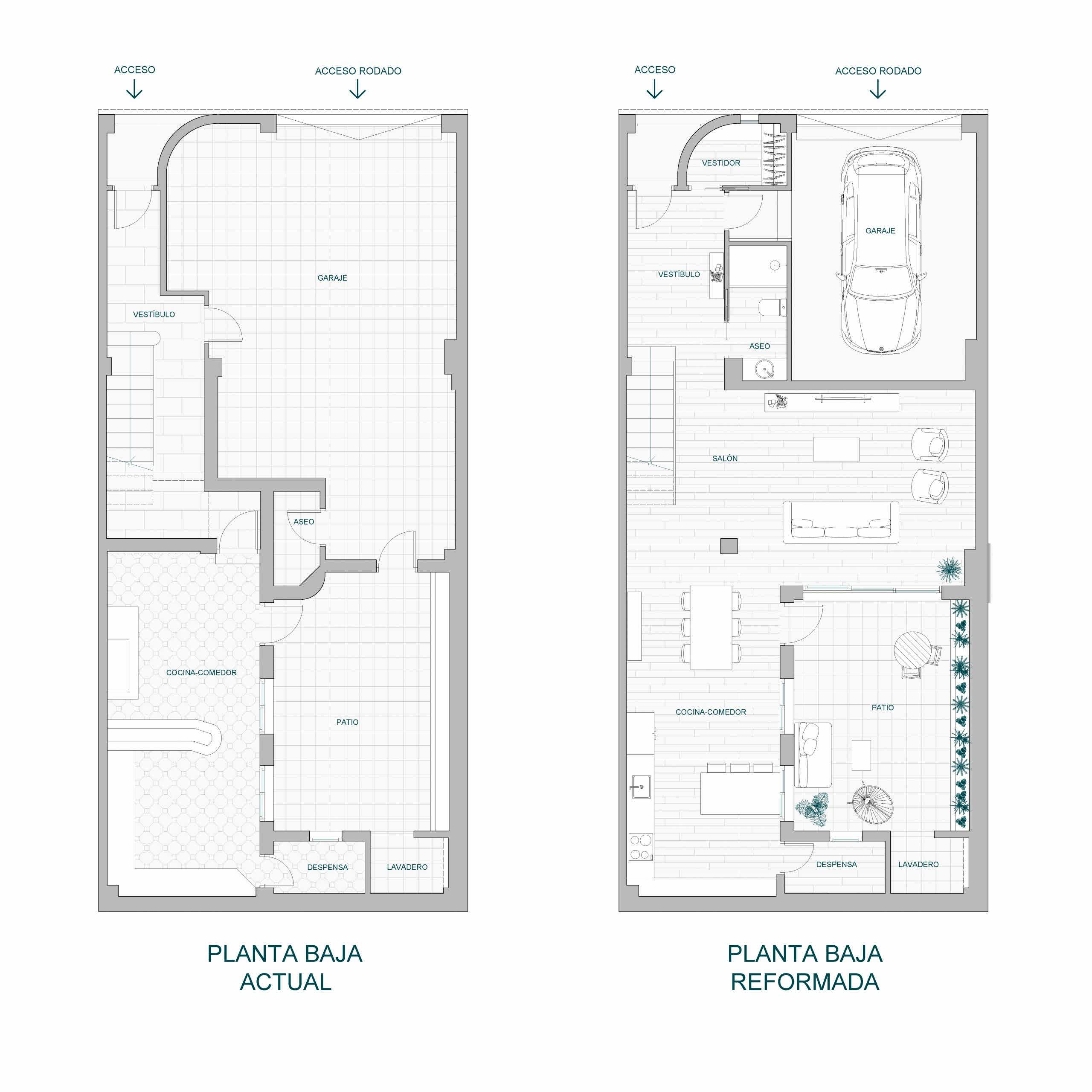 Por todo ello, se realiza una reforma integral que mejora la funcionalidad de toda la vivienda. Se crea de un gran espacio en la planta baja que engloba garaje, un acceso de mayor tamaño con vestidor y aseo y un gran espacio salón-comedor-cocina que se abre al patio de la vivienda, integrando este espacio exterior como una sala más del espacio.