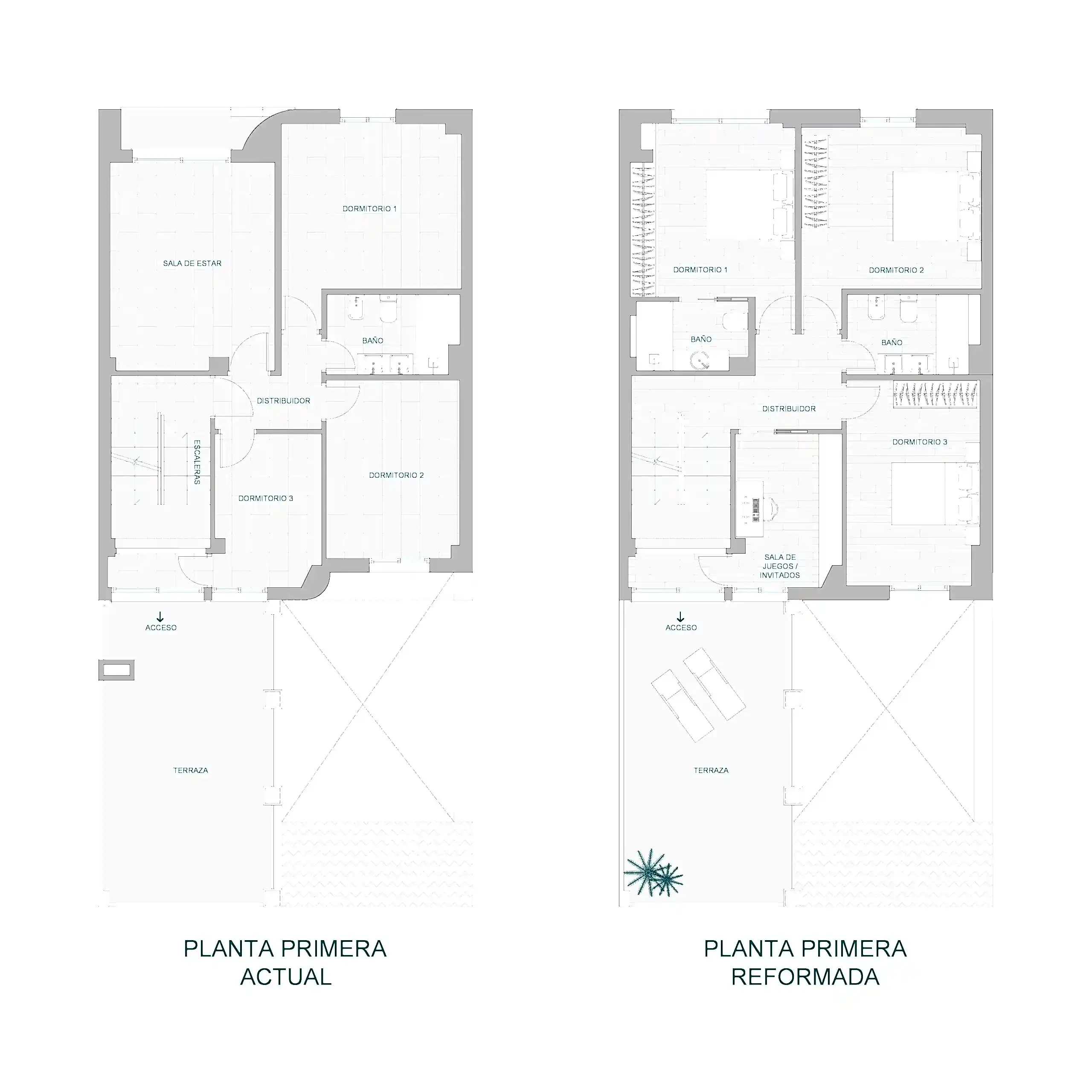 Por otra parte, la planta primera se redistribuye para crear un dormitorio tipo en suite con baño integrado y dos dormitorios y un baño común.