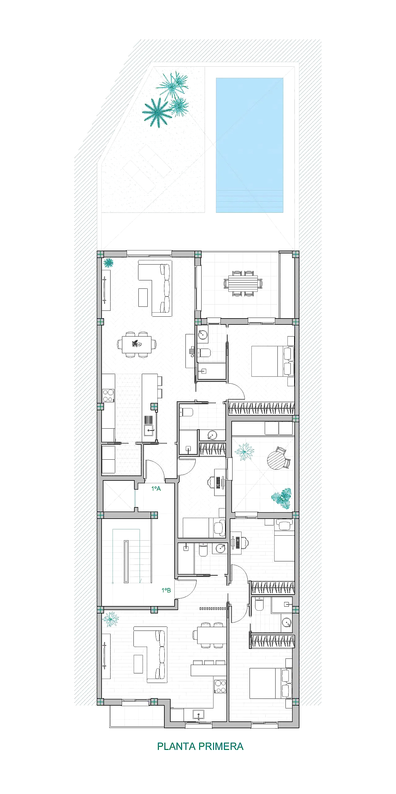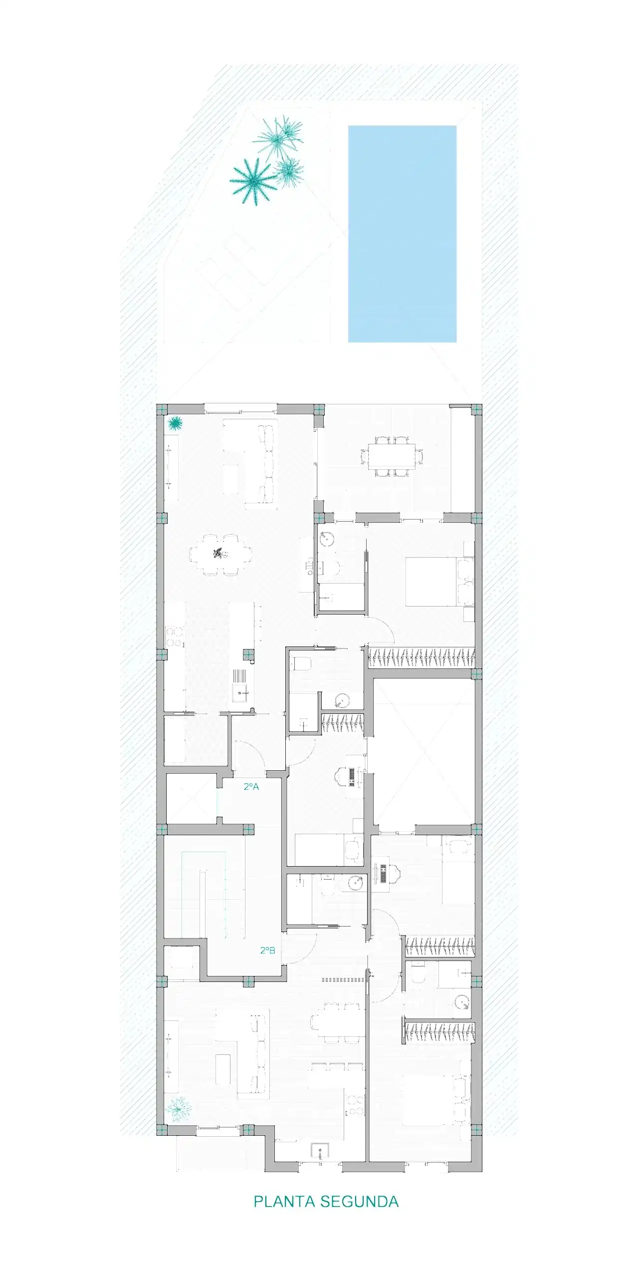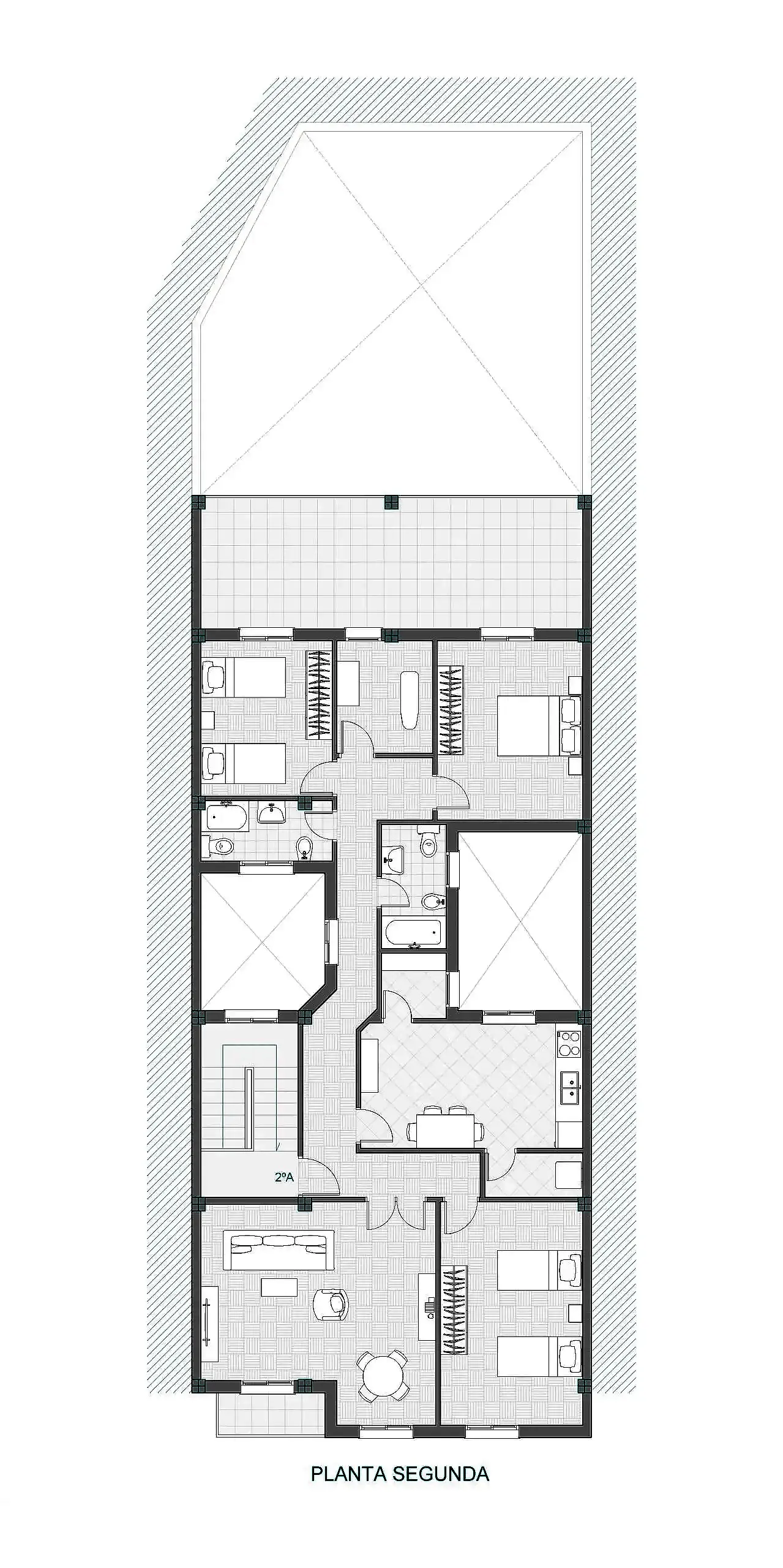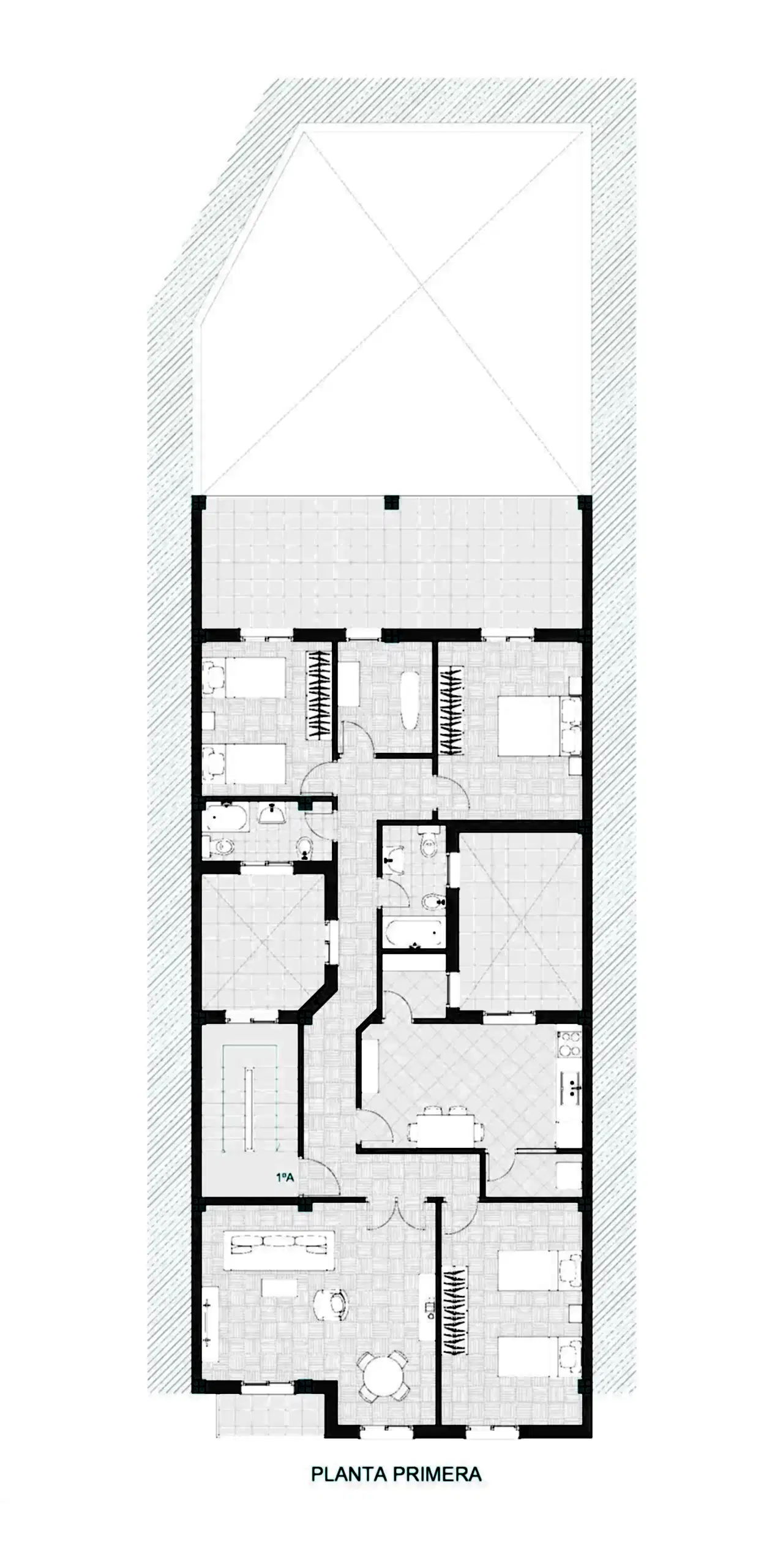 La premisa del proyecto, tal y como describe su nombre, es obtener cuatro viviendas en lugar de dos. Para ello, concebimos las viviendas de una forma más actual, donde predominan la funcionalidad y el buen diseño al cúmulo de espacios de grandes dimensiones unidos por un pasillo interminable.