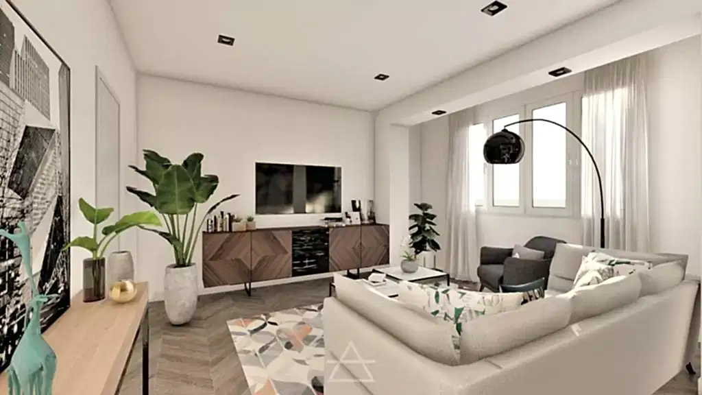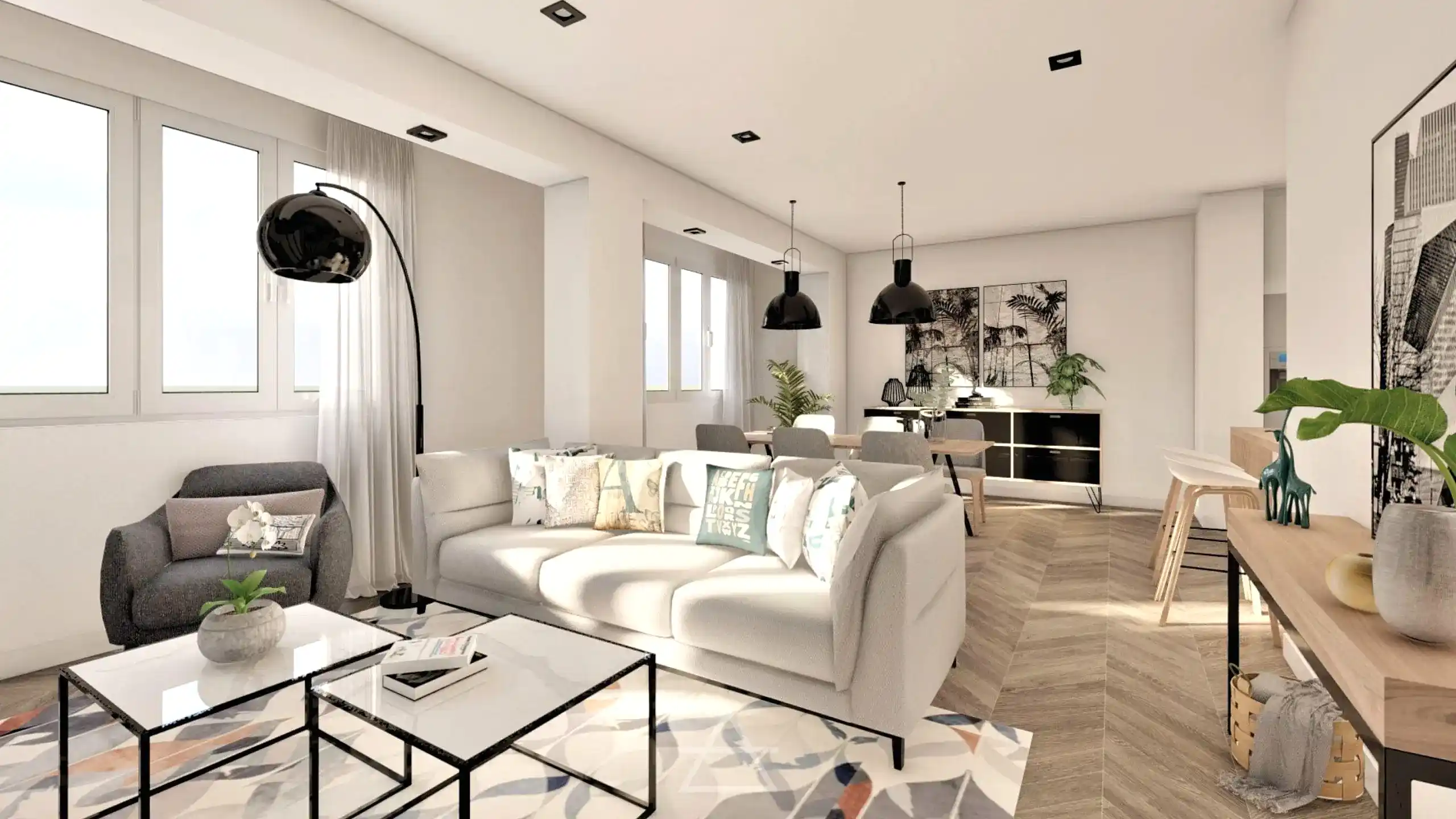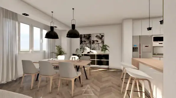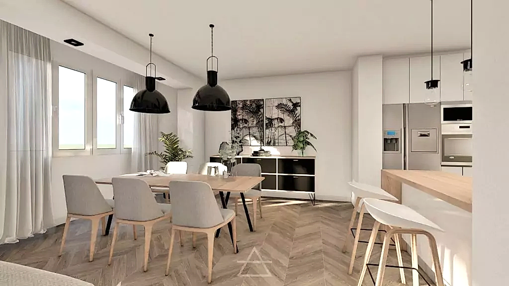 Para ello se propone un concepto de espacio abierto en la zona de día que aúna el vestíbulo, la cocina, el salón y el comedor, consiguiendo un espacio mucho más amplio y funcional. el espacio tenga luz y ventilación cruzada al tener dos grandes ventanas opuestas. La zona de noche queda en un segundo plano, separada por un pequeño vestíbulo con puerta corredera.