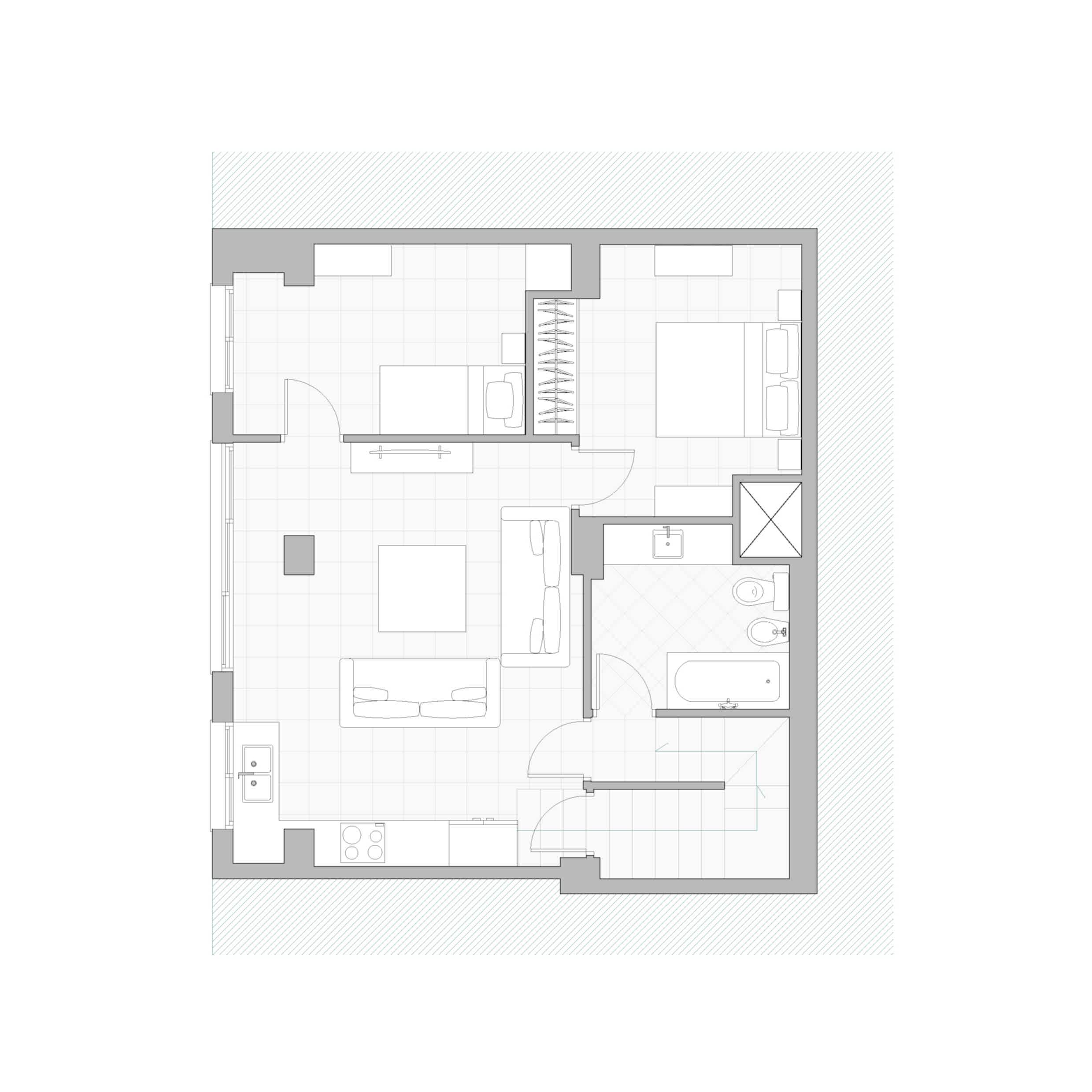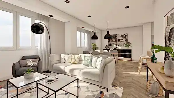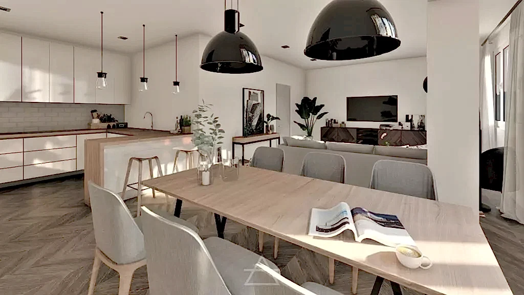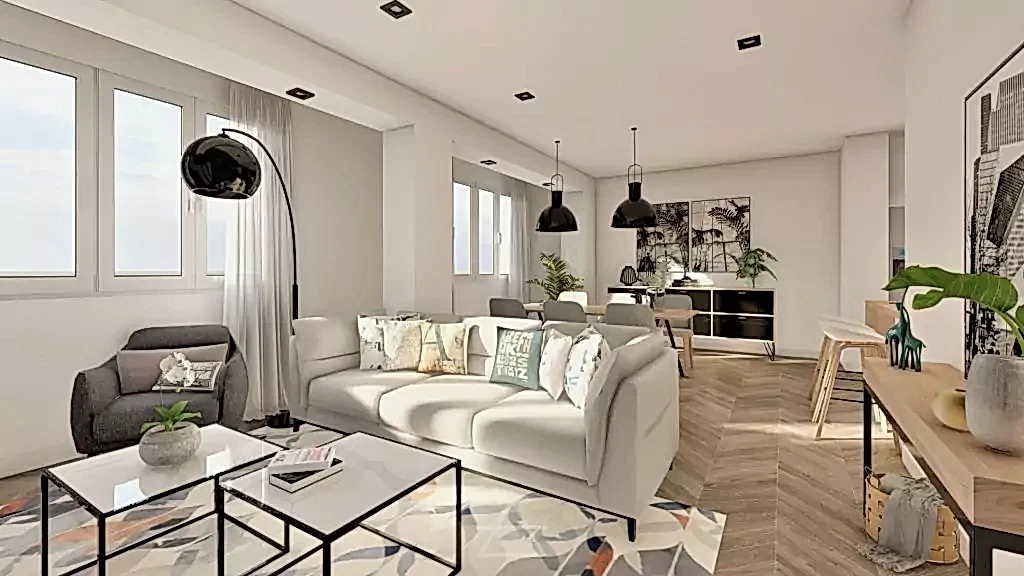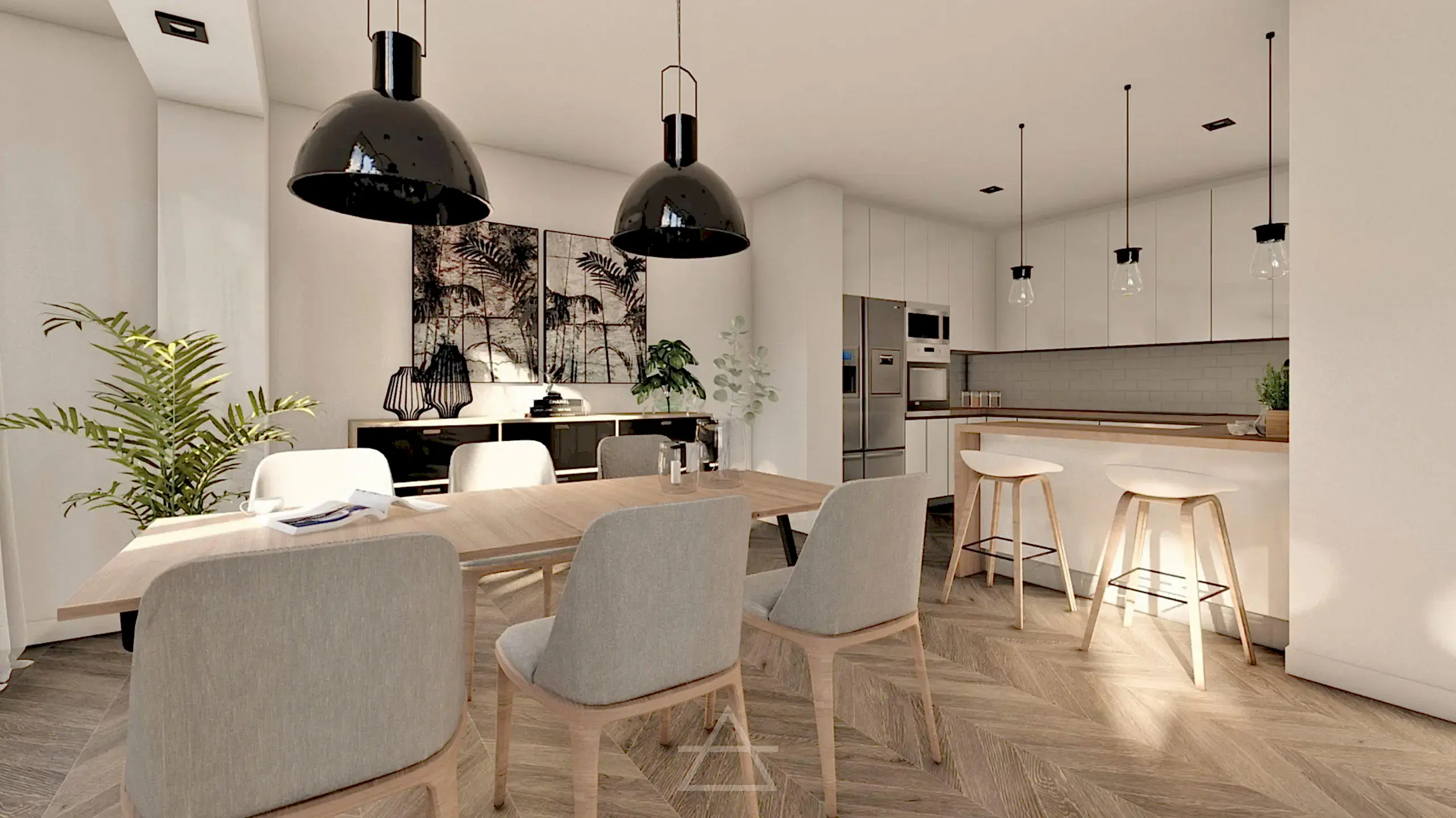 Para ello se propone un concepto de espacio abierto en la zona de día que aúna el vestíbulo, la cocina, el salón y el comedor, consiguiendo un espacio mucho más amplio y funcional. el espacio tenga luz y ventilación cruzada al tener dos grandes ventanas opuestas. La zona de noche queda en un segundo plano, separada por un pequeño vestíbulo con puerta corredera.