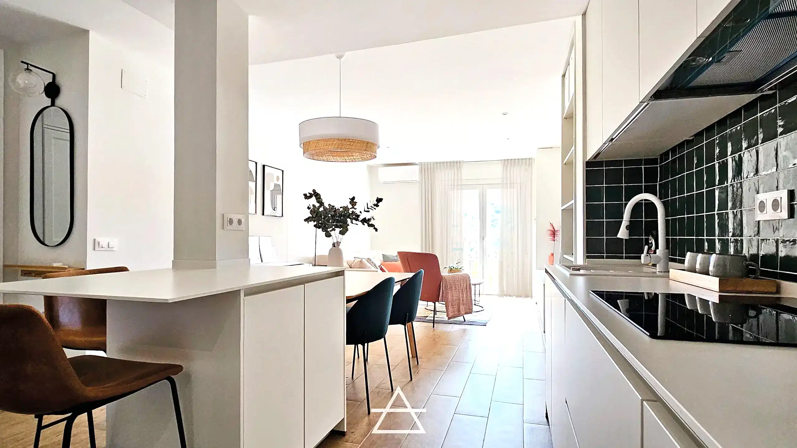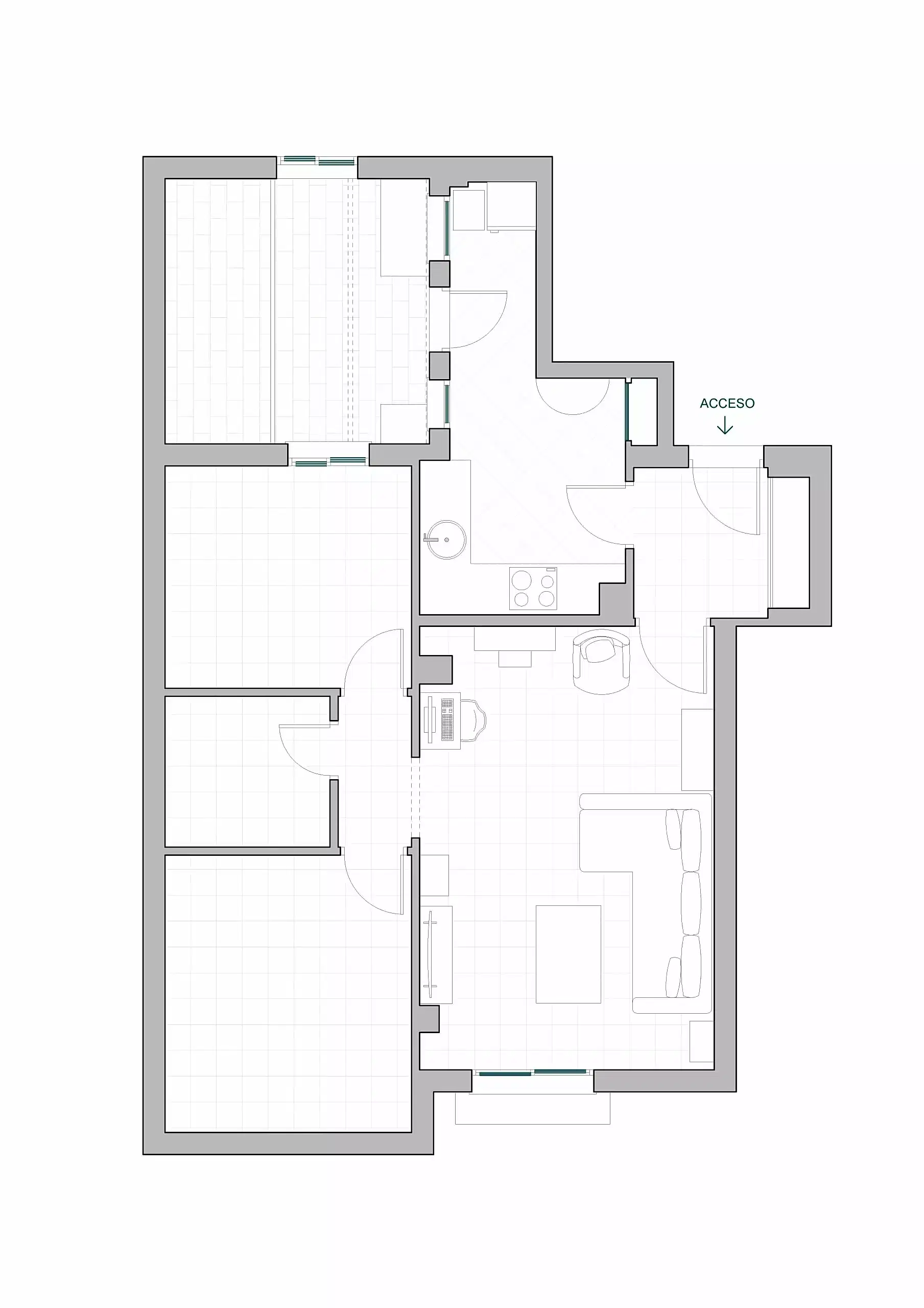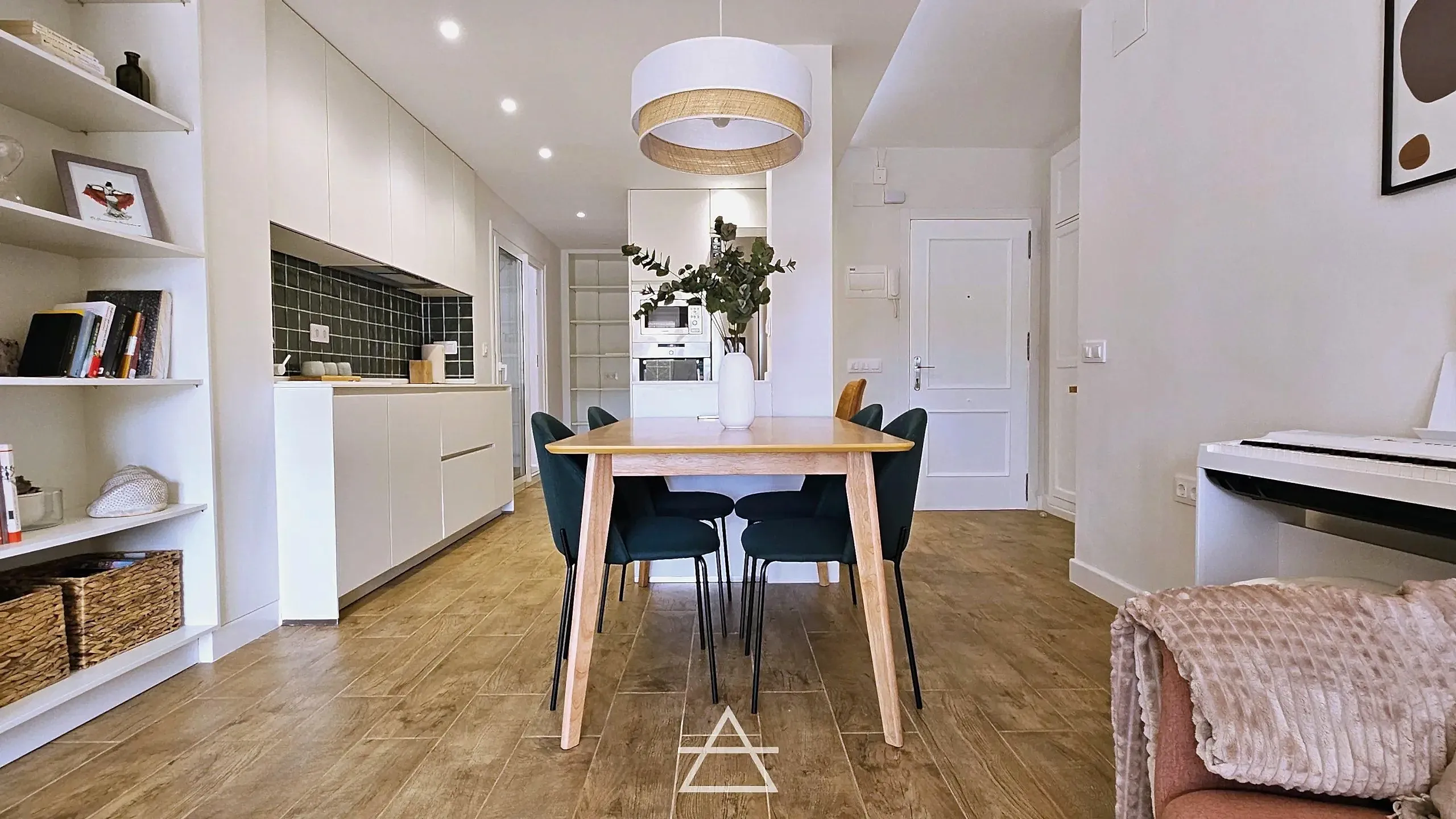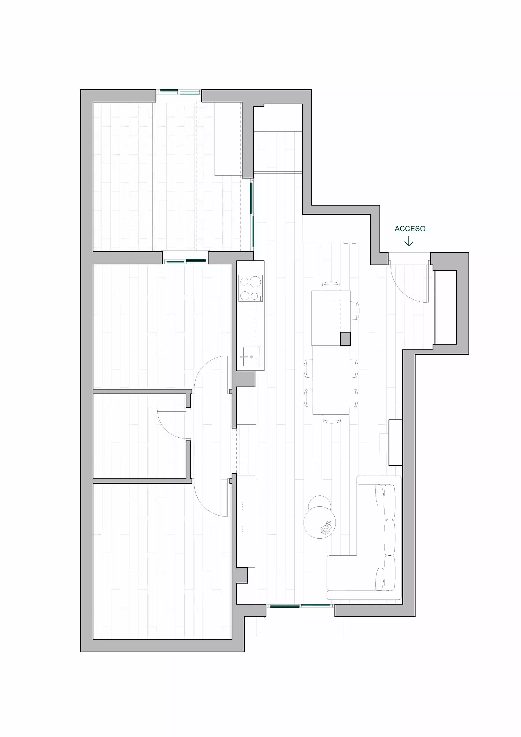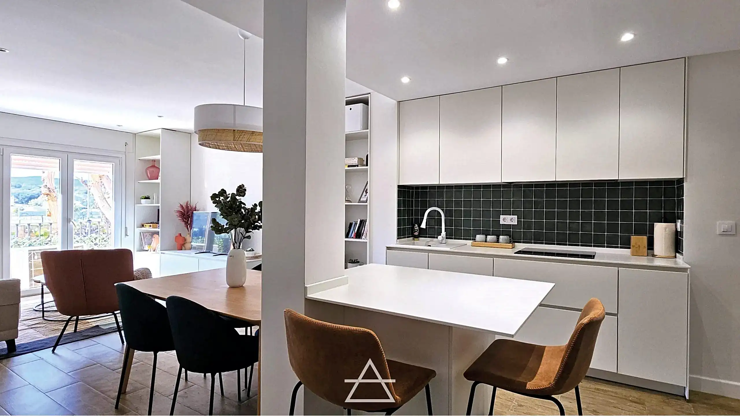 En este proyecto hemos unificado los espacios de salón, cocina y vestíbulo de entrada, creando un espacio abierto más amplio y luminoso donde el mobiliario es el que delimita cada zona y su función.