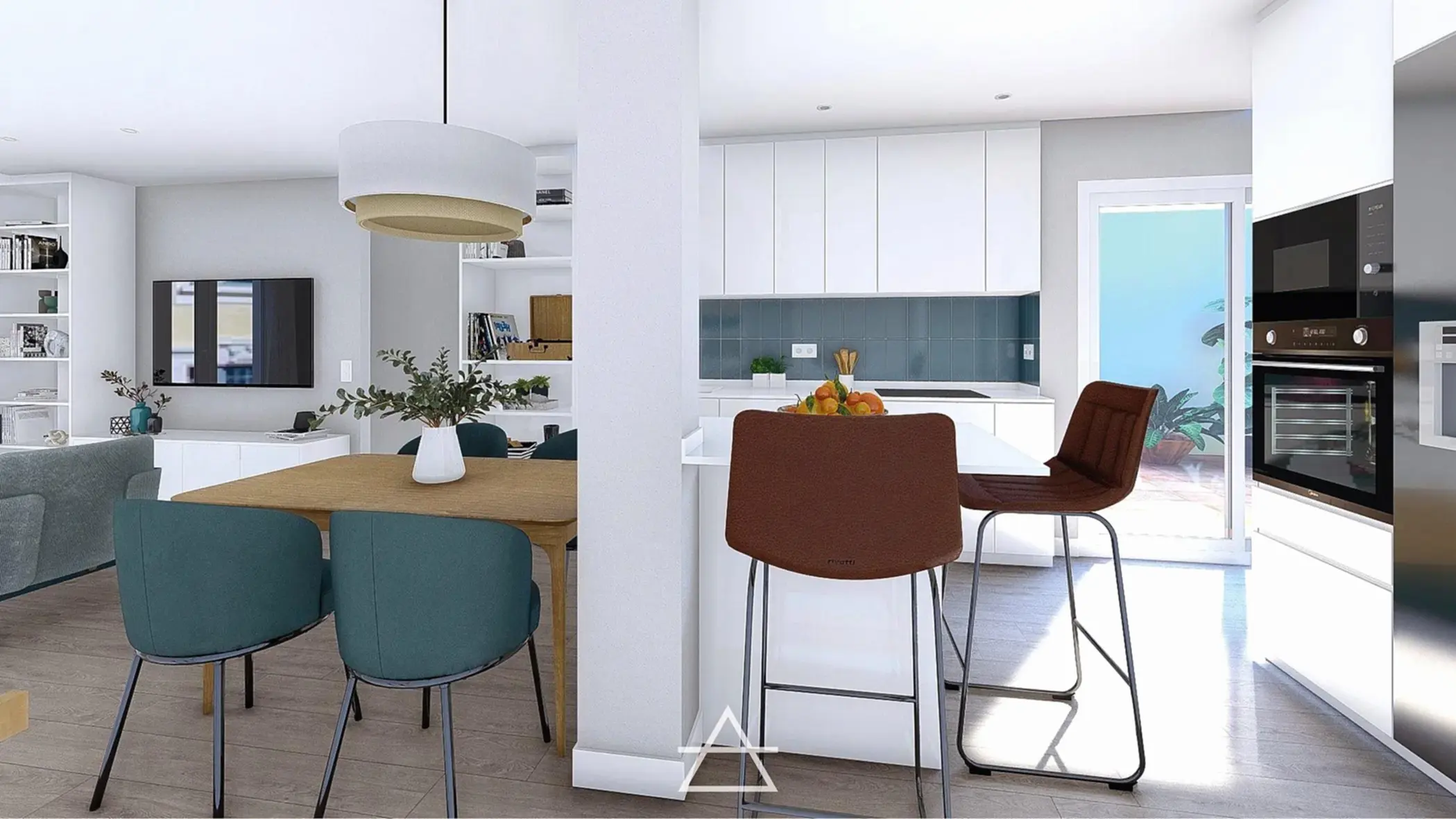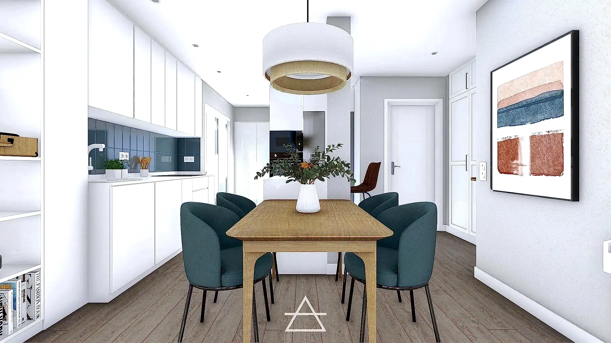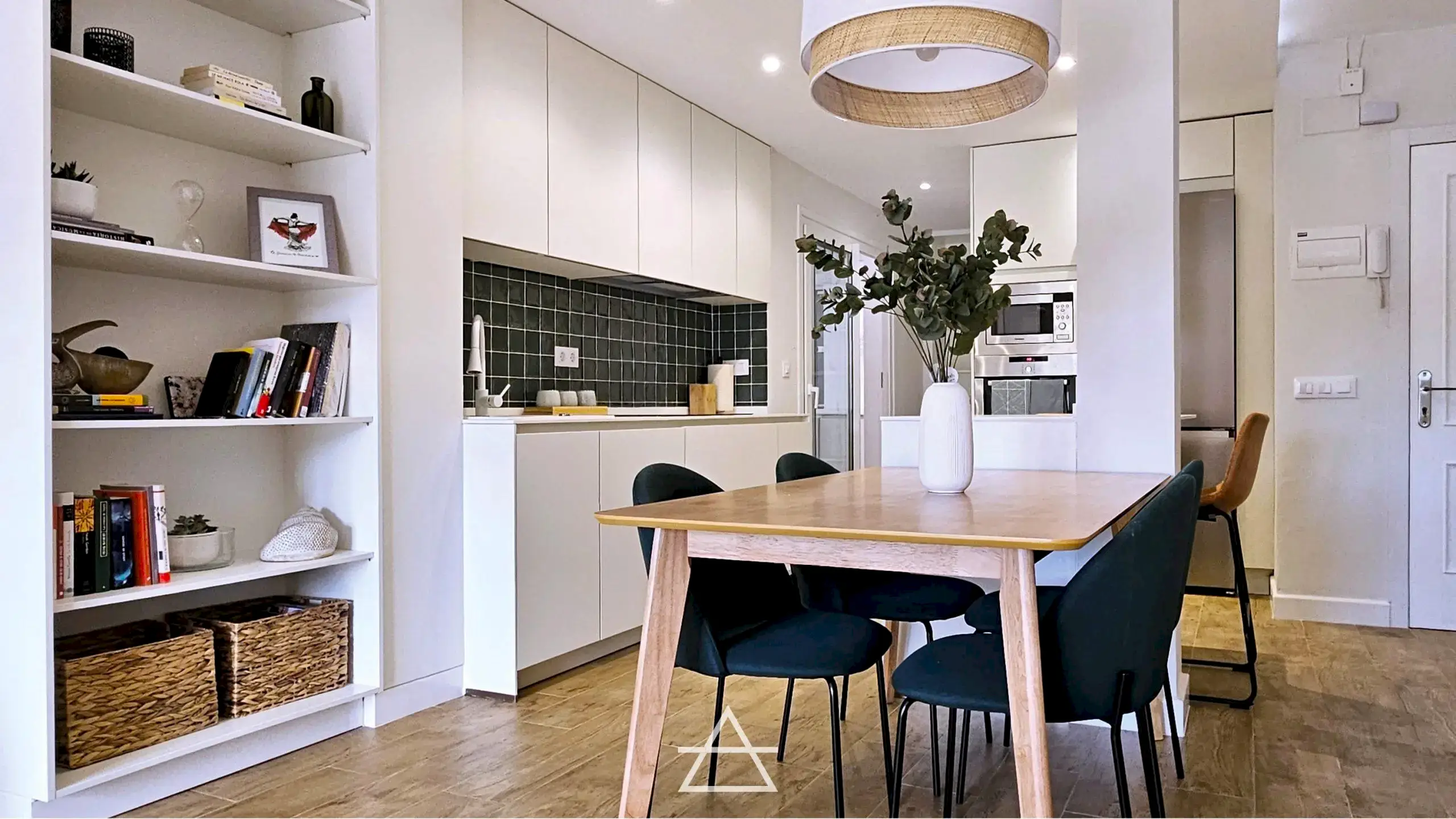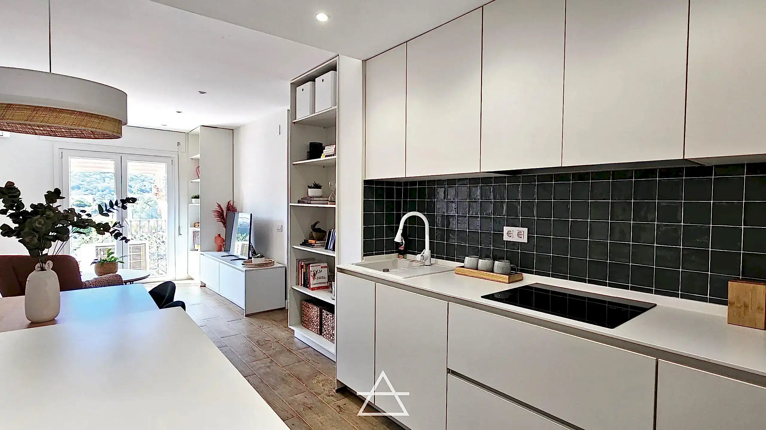 En este proyecto hemos unificado los espacios de salón, cocina y vestíbulo de entrada, creando un espacio abierto más amplio y luminoso donde el mobiliario es el que delimita cada zona y su función.