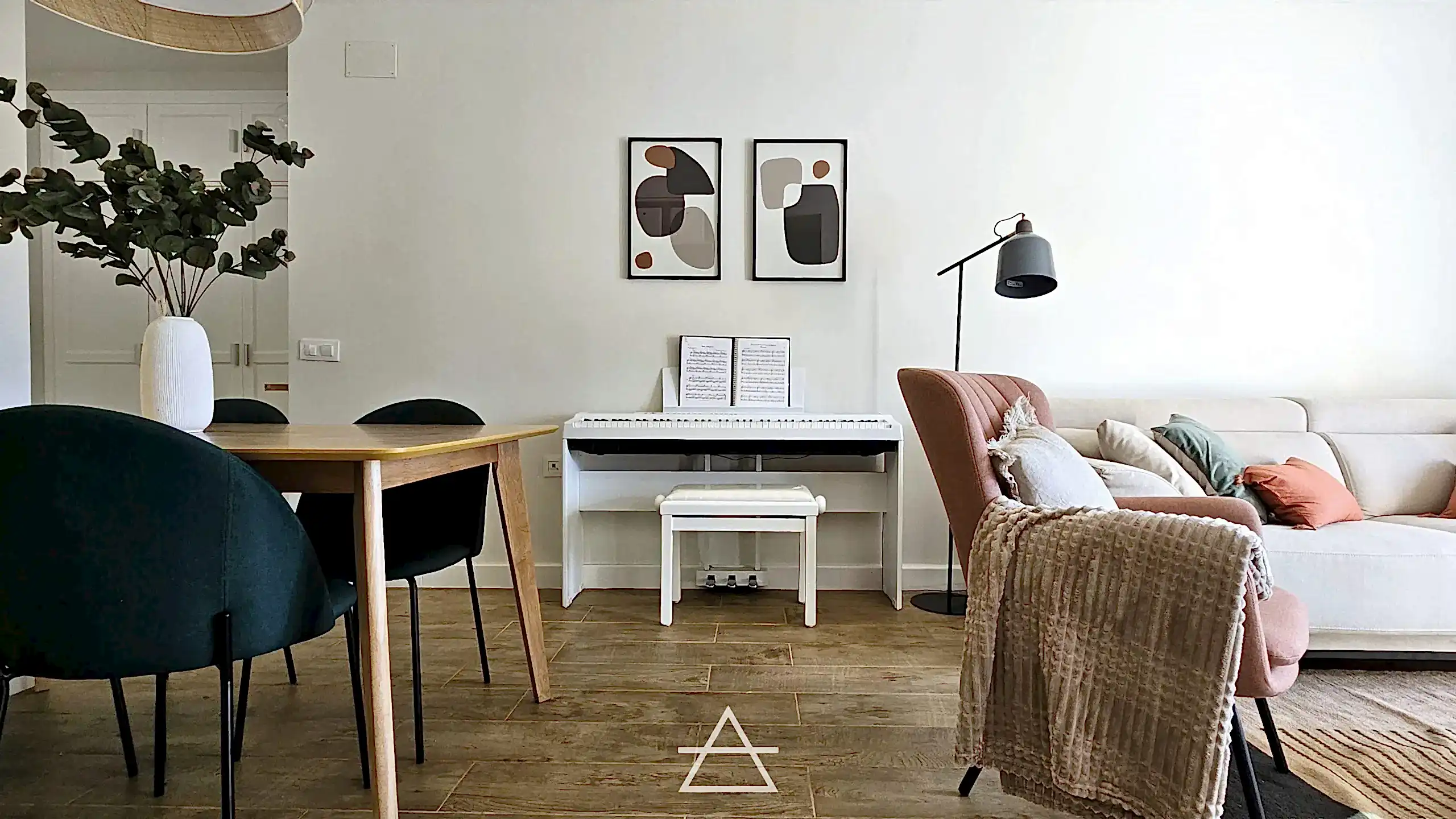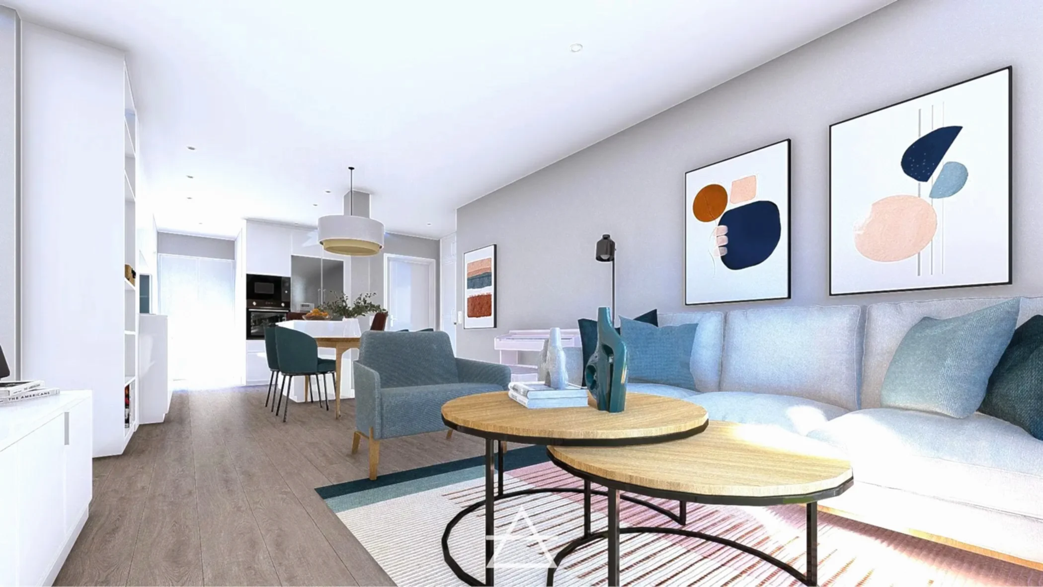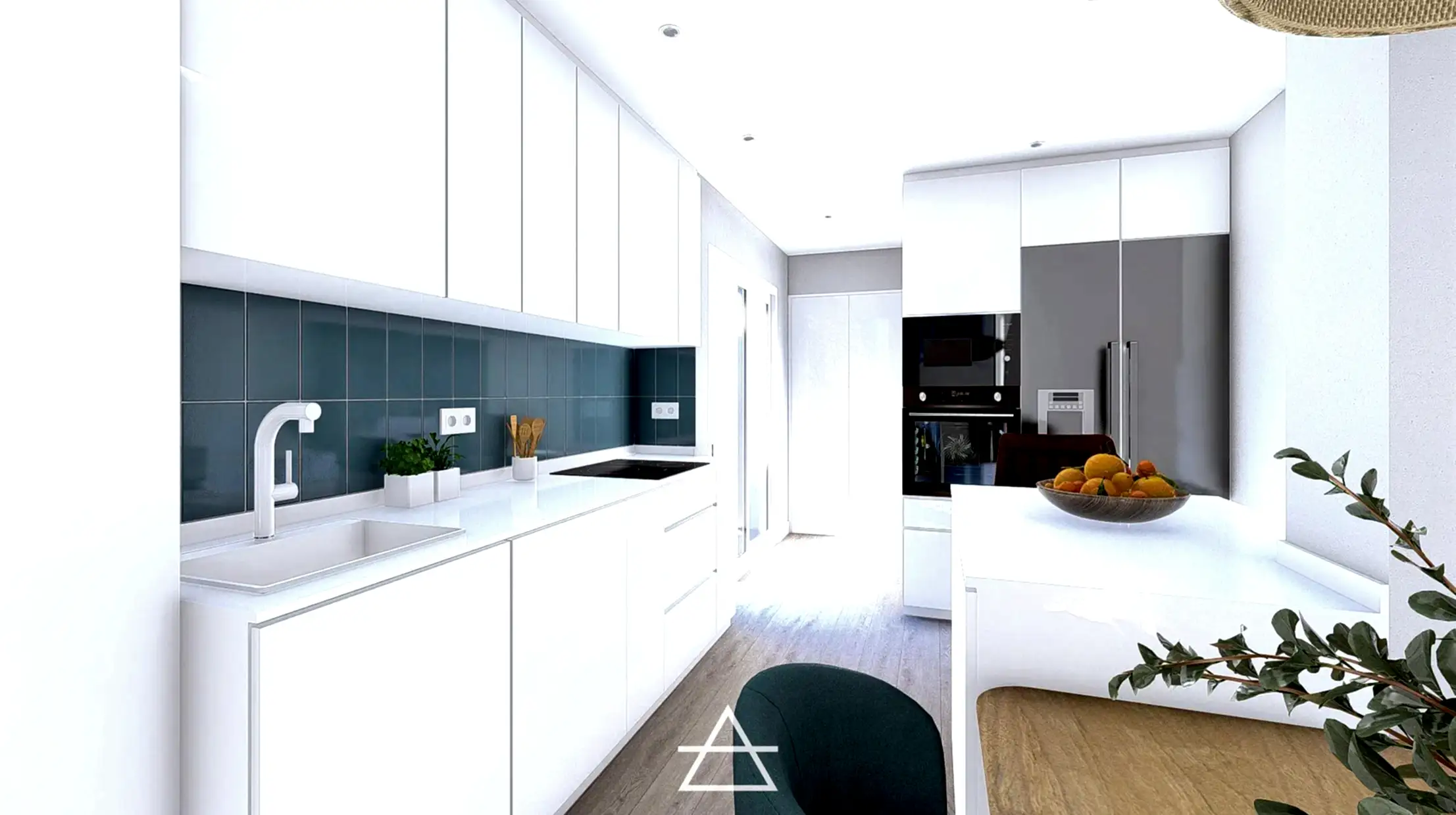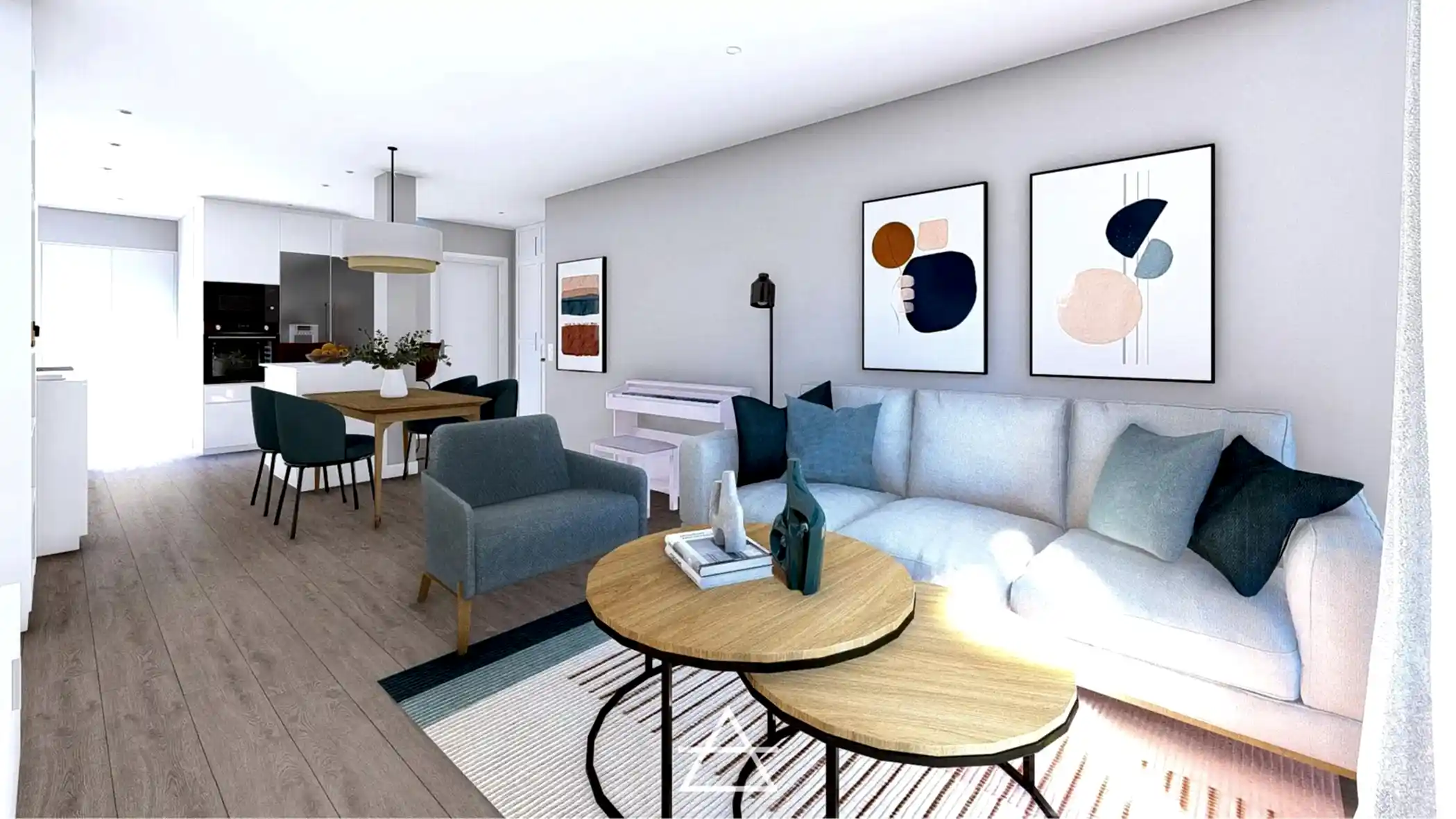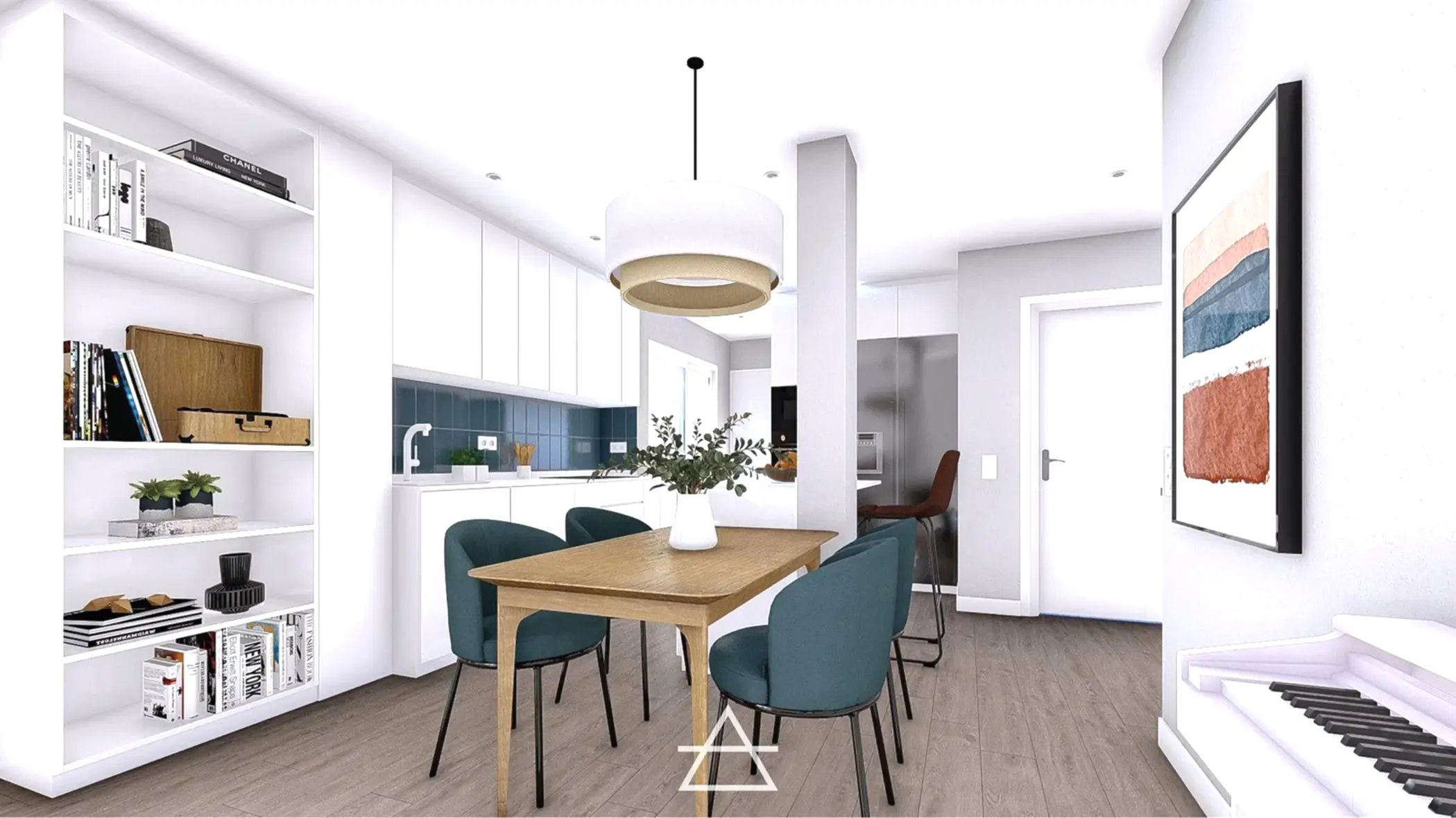 En este proyecto hemos unificado los espacios de salón, cocina y vestíbulo de entrada, creando un espacio abierto más amplio y luminoso donde el mobiliario es el que delimita cada zona y su función.