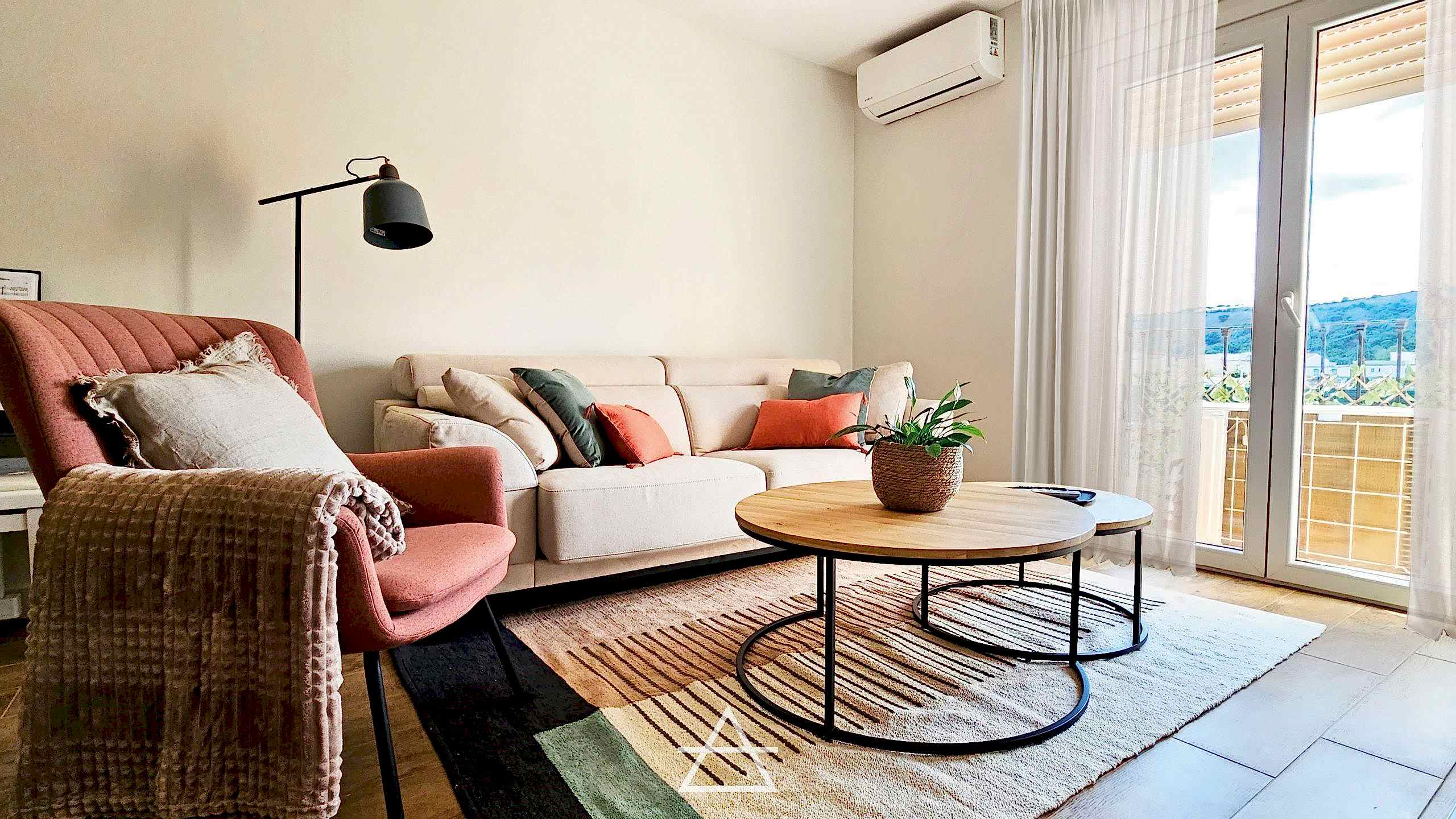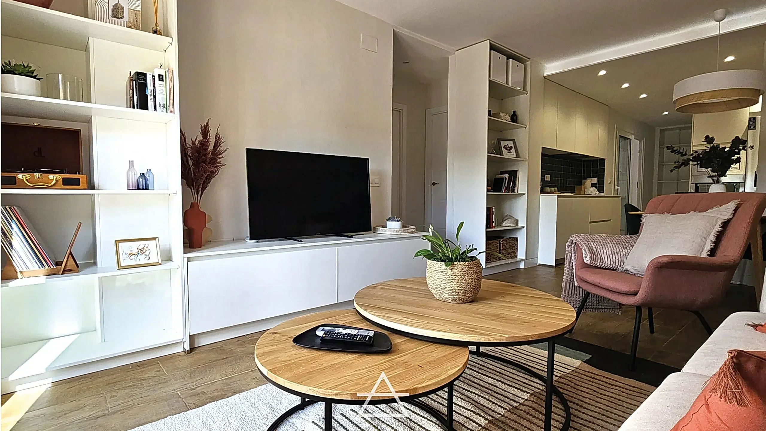También se ha diseñado a medida el mobiliario de cocina, televisión y almacenaje para que formen un conjunto visual único. Gracias a ello conseguimos aprovechar al máximo el espacio y disimular los pilares situados en la pared principal, además de crear un diseño limpio y elegante donde los distintos elementos de decoración aportan color y textura.